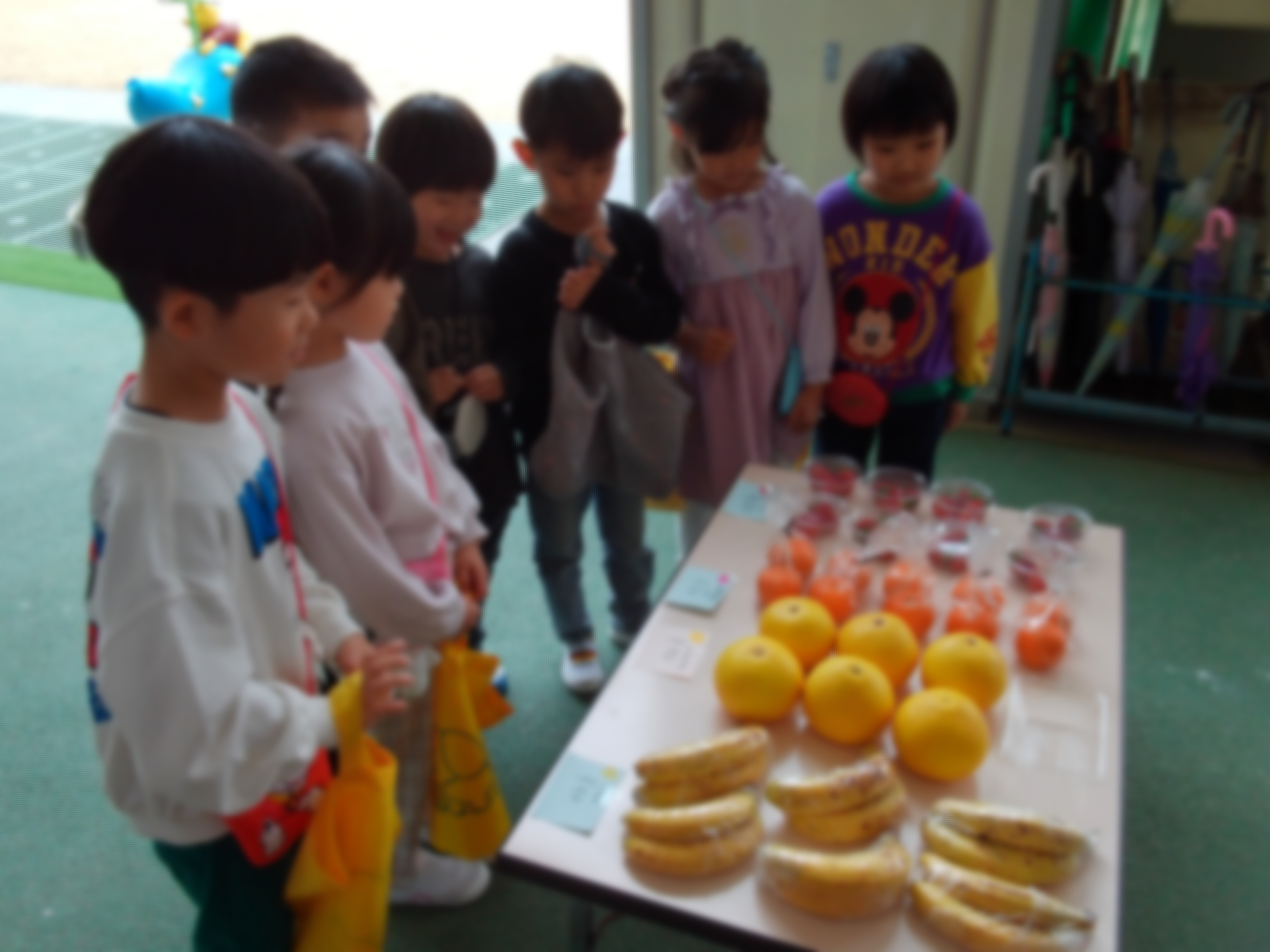 子どもたちは、お財布を握りしめて、お花、野菜、果物、パン、駄菓子、文房具などの